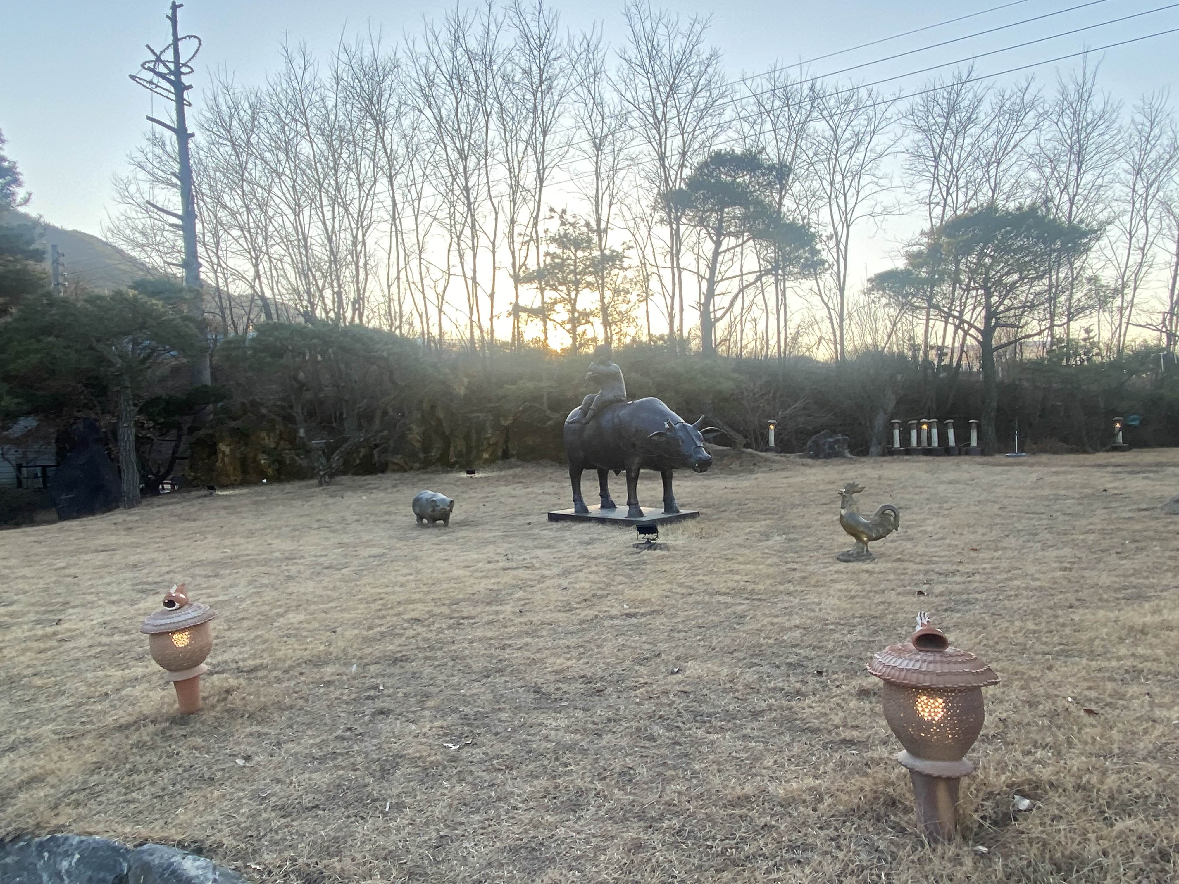 입구쪽부터 소, 돼지, 닭 모형이 있습니다.